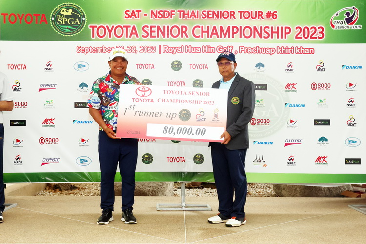 ภาพกลาง • สิทธิชัย เหล็งศรีชะเอม (ซ้าย) อุปนายก สมาคมกีฬากอล์ฟอาชีพอาวุโสไทย มอบเช็คเงินรางวัลให้กับประหยัด มากแสง ที่คว้าอันดับ 2 ในการแข่งขันโตโยต้า ซีเนียร์ แชมเปี้ยนชิพ 2023 รอบสุดท้ายของการแข่งขันเมื่อวันที่ 28 กันยายน 2566 ที่สนามกอล์ฟหลวงหัวหิน