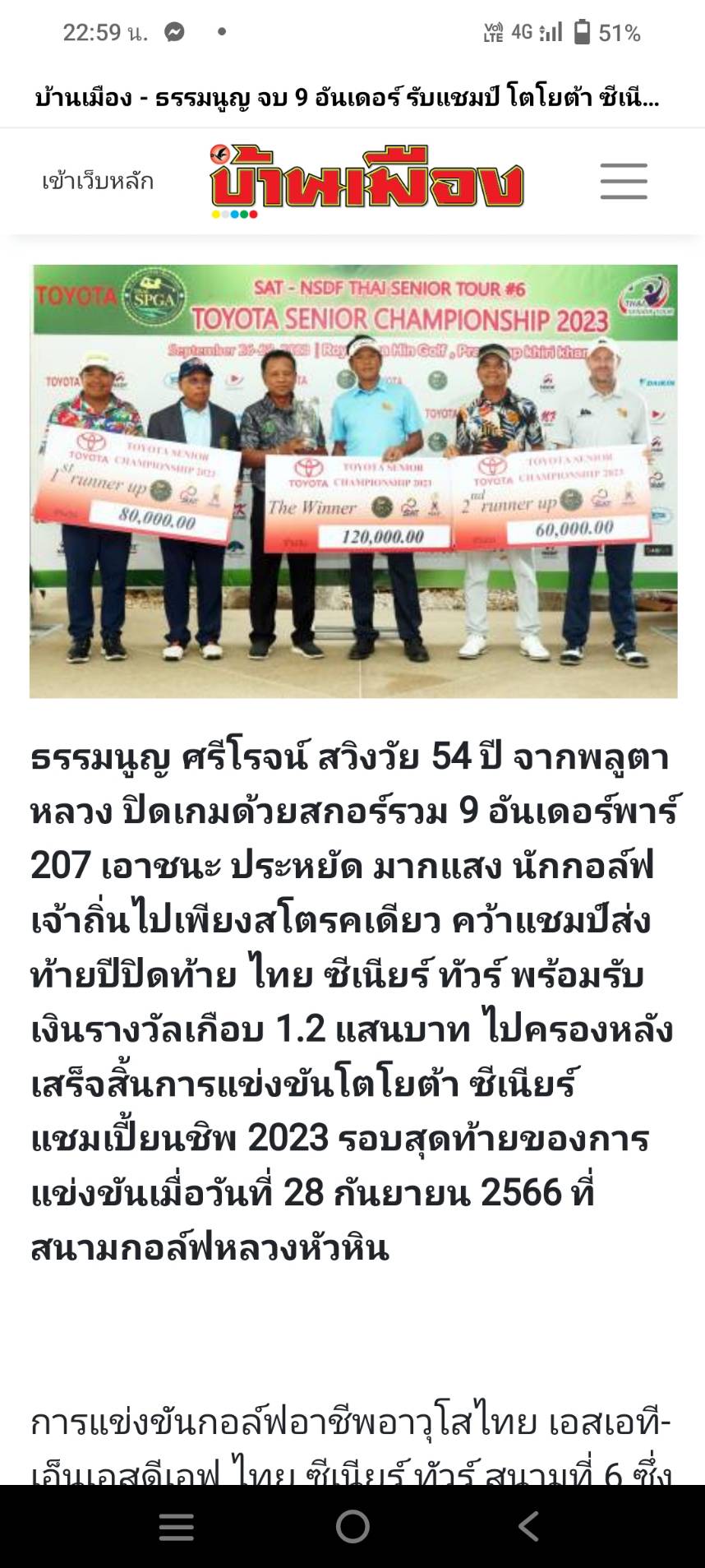 ธรรมนูญ ศรีโรจน์ สวิงวัย 54 ปี จากพลูตาหลวง ปิดเกมด้วยสกอร์รวม 9 อันเดอร์พาร์ 207 เอาชนะ ประหยัด มากแสง นักกอล์ฟเจ้าถิ่นไปเพียงสโตรคเดียว คว้าแชมป์ส่งท้ายปีปิดท้าย ไทย ซีเนียร์ ทัวร์ พร้อมรับเงินรางวัลเกือบ 1.2 แสนบาท ไปครองหลังเสร็จสิ้นการแข่งขันโตโยต้า ซีเนียร์ แชมเปี้ยนชิพ 2023 รอบสุดท้ายของการแข่งขันเมื่อวันที่ 28 กันยายน 2566 ที่สนามกอล์ฟหลวงหัวหิน กดดูรายละเอียดได้ที่ : https://www.siamsport.co.th/other-sports/golf/32707/