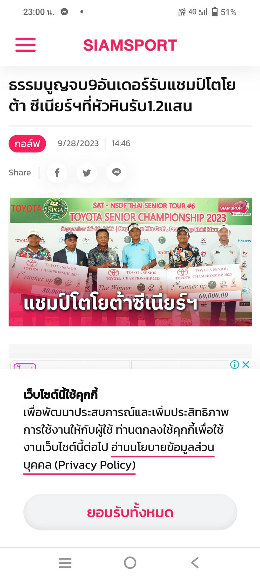 รายการ “SAT-NSDF Thai Senior Tour#6”,”TOYOTA SENIOR CHAMPIONSHIP 2023” ระหว่างวันที่ 26 - 28 กันยายน 2566 ชิงเงินรางวัล 1,000,000 บาท (หนึ่งล้านบาทถ้วน)