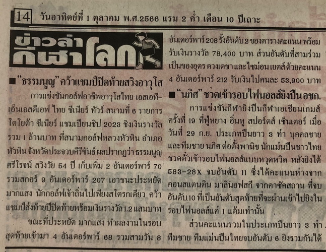 ธรรมนูญ ศรีโรจน์ สวิงวัย 54 ปี จากพลูตาหลวง ปิดเกมด้วยการทำ 2 อันเดอร์พาร์ 70 รวมสกอร์ 9 อันเดอร์พาร์ 207 เอาชนะ ประหยัด มากแสง นักกอล์ฟเจ้าถิ่นไปเพียงสโตรคเดียว คว้าแชมป์ส่งท้ายปีปิดท้าย ไทย ซีเนียร์ ทัวร์ พร้อมรับเงินรางวัลเกือบ 1.2 แสนบาท ไปครองหลังเสร็จสิ้นการแข่งขัน โตโยต้า ซีเนียร์ แชมเปี้ยนชิพ 2023 รอบสุดท้ายของการแข่งขันเมื่อวันที่ 28 กันยายน 2566 ที่สนามกอล์ฟหลวงหัวหิน
