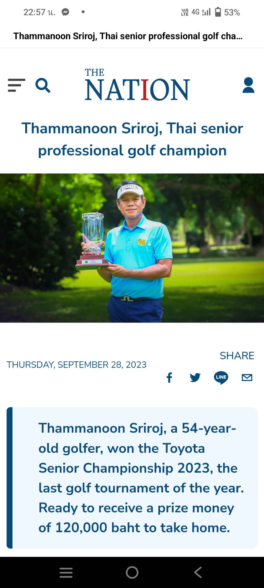 Thammanoon Sriroj, a 54-year-old golfer, won the Toyota Senior Championship 2023, the last golf tournament of the year. Ready to receive a prize money of 120,000 baht to take home.